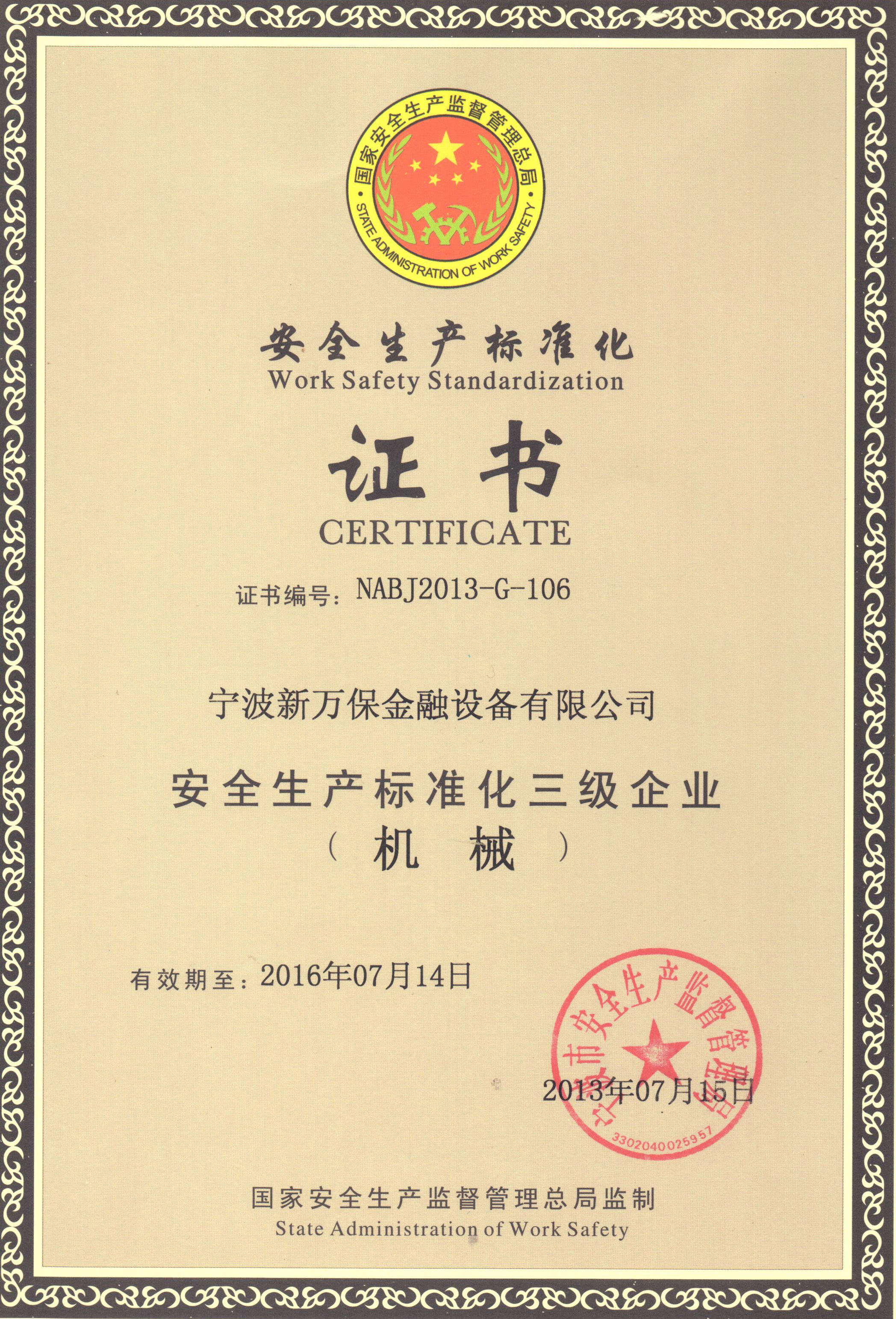 安全標(biāo)準(zhǔn)化生產(chǎn)三級(jí)企業(yè)證書(shū)