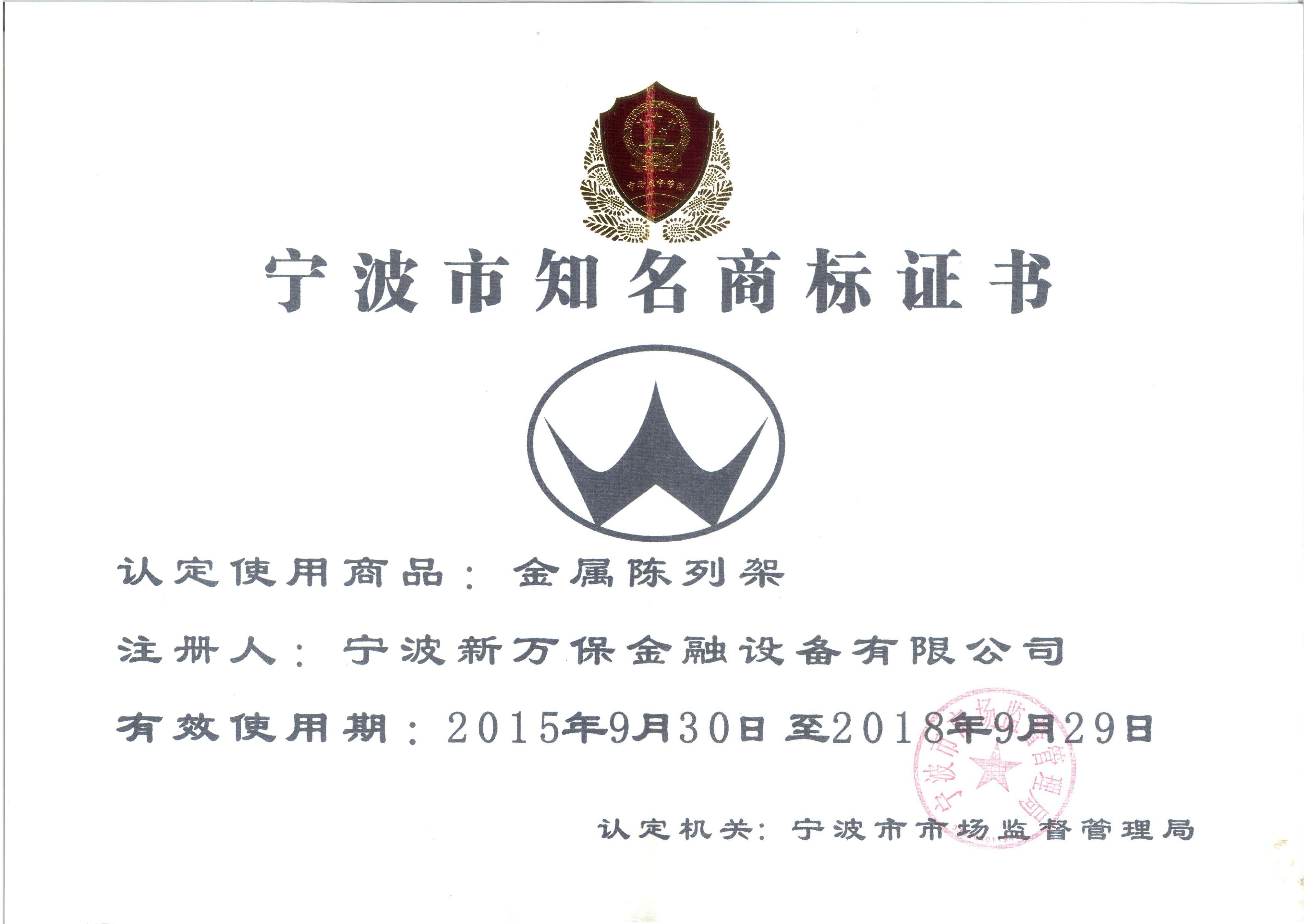 寧波市知名商標(biāo)證書(shū)