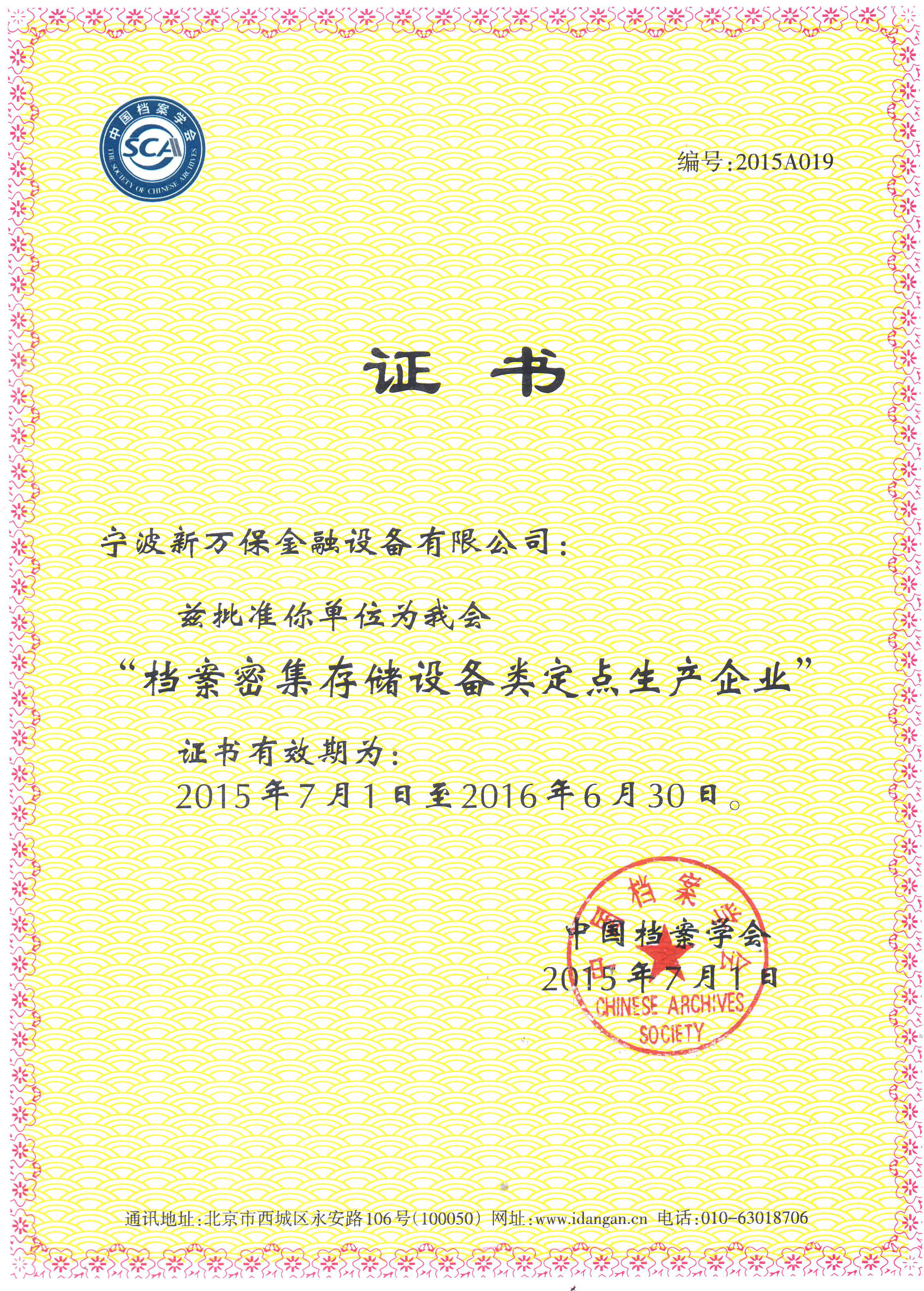 中國(guó)檔案學(xué)會(huì)定點(diǎn)生產(chǎn)企業(yè)證書(shū)