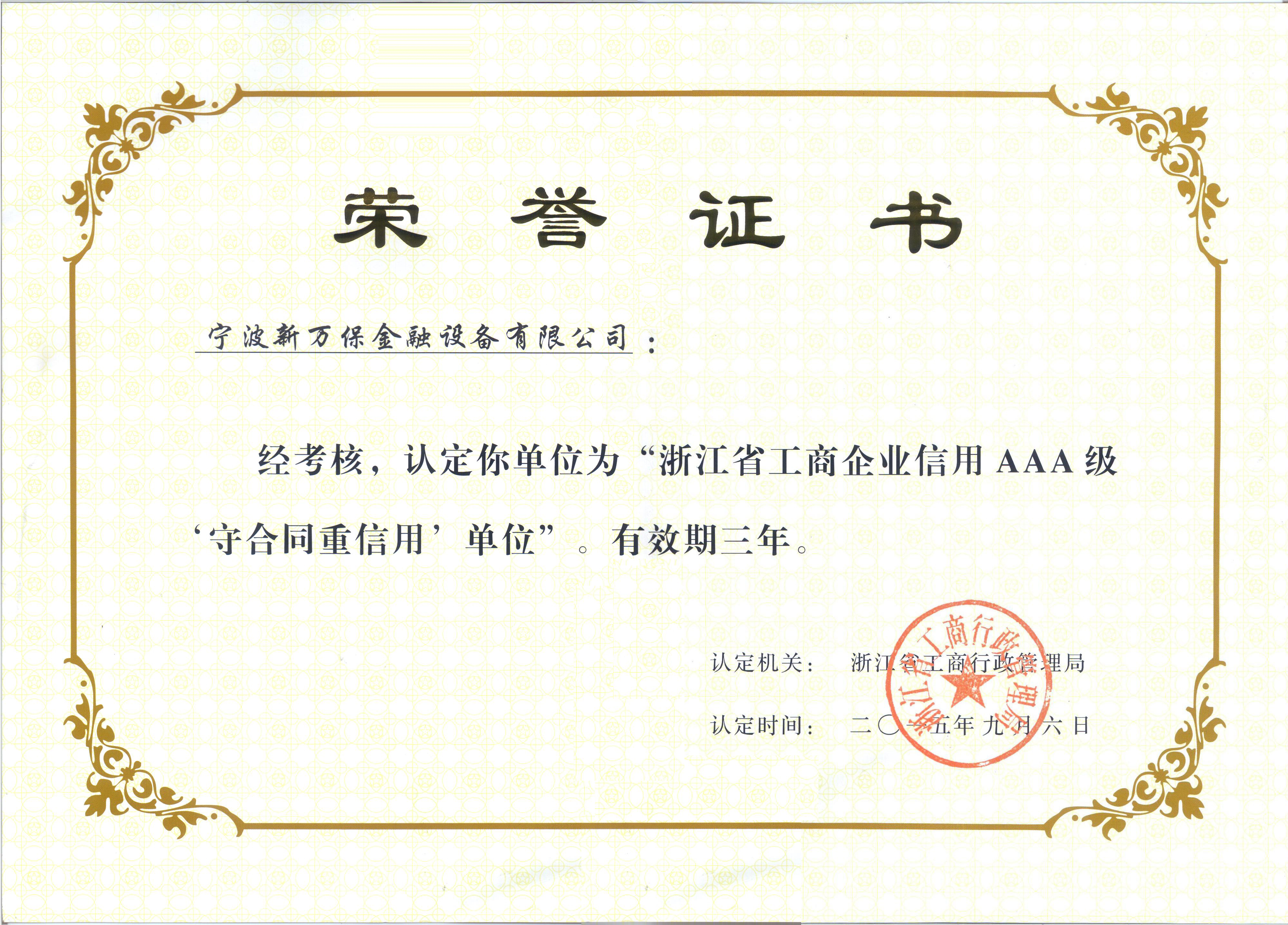 浙江省“守合同重信用”AAA級(jí)單位證書(shū)