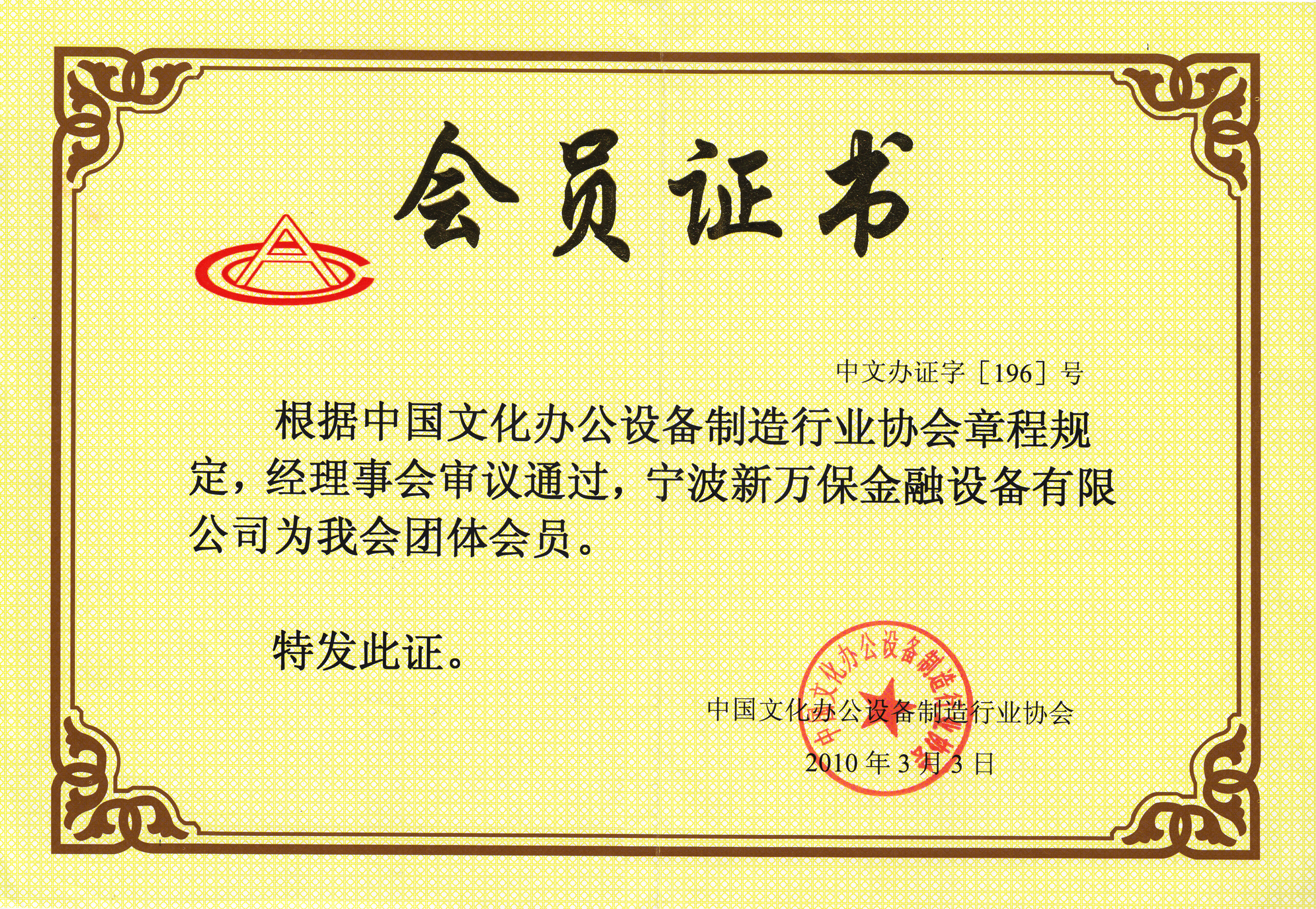 中國(guó)文件辦公設(shè)備制造行業(yè)協(xié)會(huì)會(huì)員證書(shū)