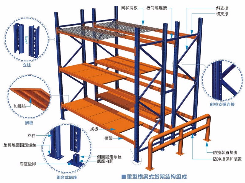 重型橫梁式貨架又稱貨位式貨架、托盤式貨架。貨物置于托盤之上,由叉車進(jìn)行存取貨物,存放方便靈活。適合存放多品種、大批量的各種產(chǎn)品;且承載能力大,每層最大承載可達(dá)2000kg,孔距75mm可上下調(diào)節(jié)。廣泛應(yīng)用于制造業(yè)、第三方物流業(yè)、配送中心、倉(cāng)儲(chǔ)式超市等高位倉(cāng)庫(kù)領(lǐng)域。