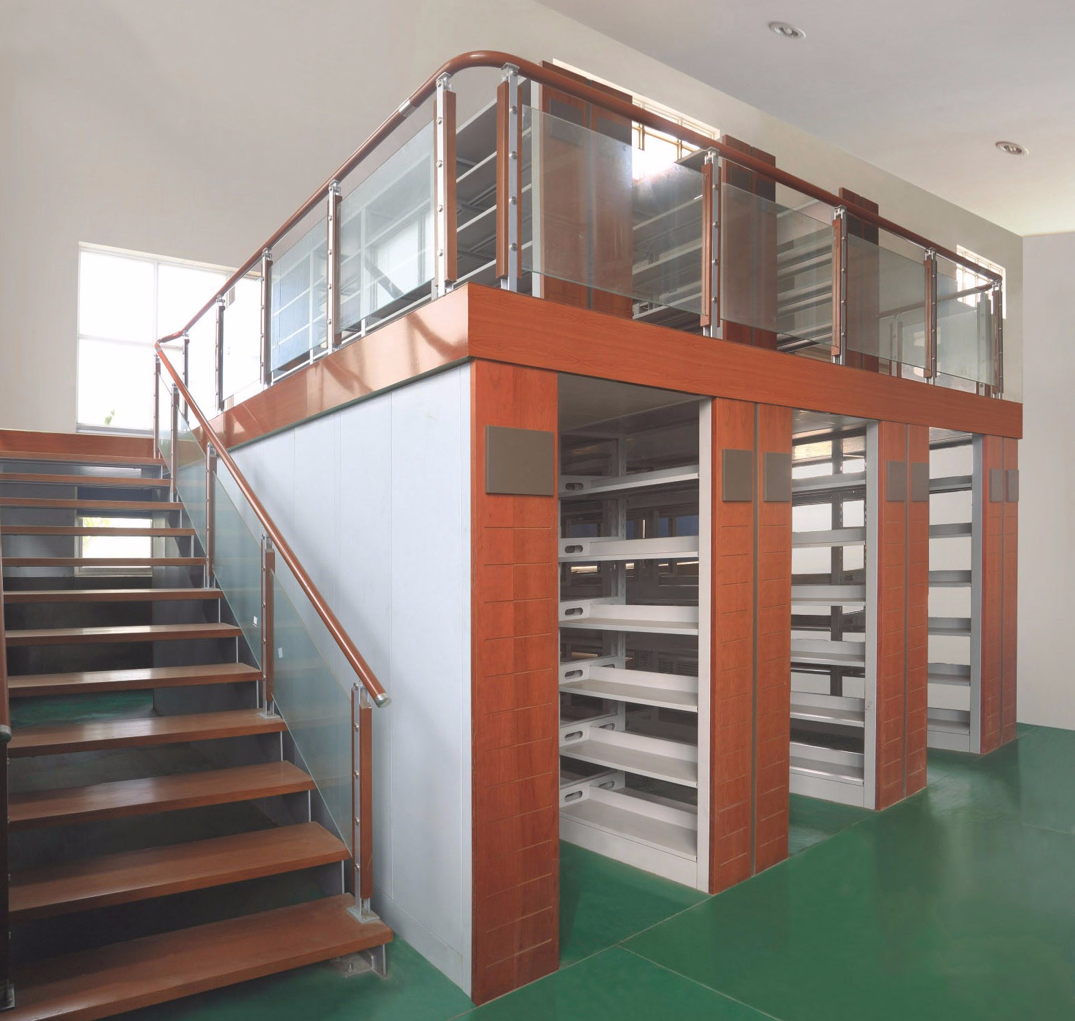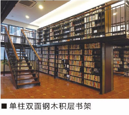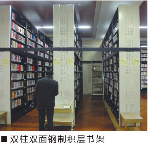 重疊組合而成的多層固定鋼制或鋼木書架,并設(shè)有樓梯上下。其上層書架荷載經(jīng)下層書架支柱傳至地面。上層書架之間的水平交通用書架層及專門鋪設(shè)的平臺(tái)解決。有單柱型及雙柱型兩種。